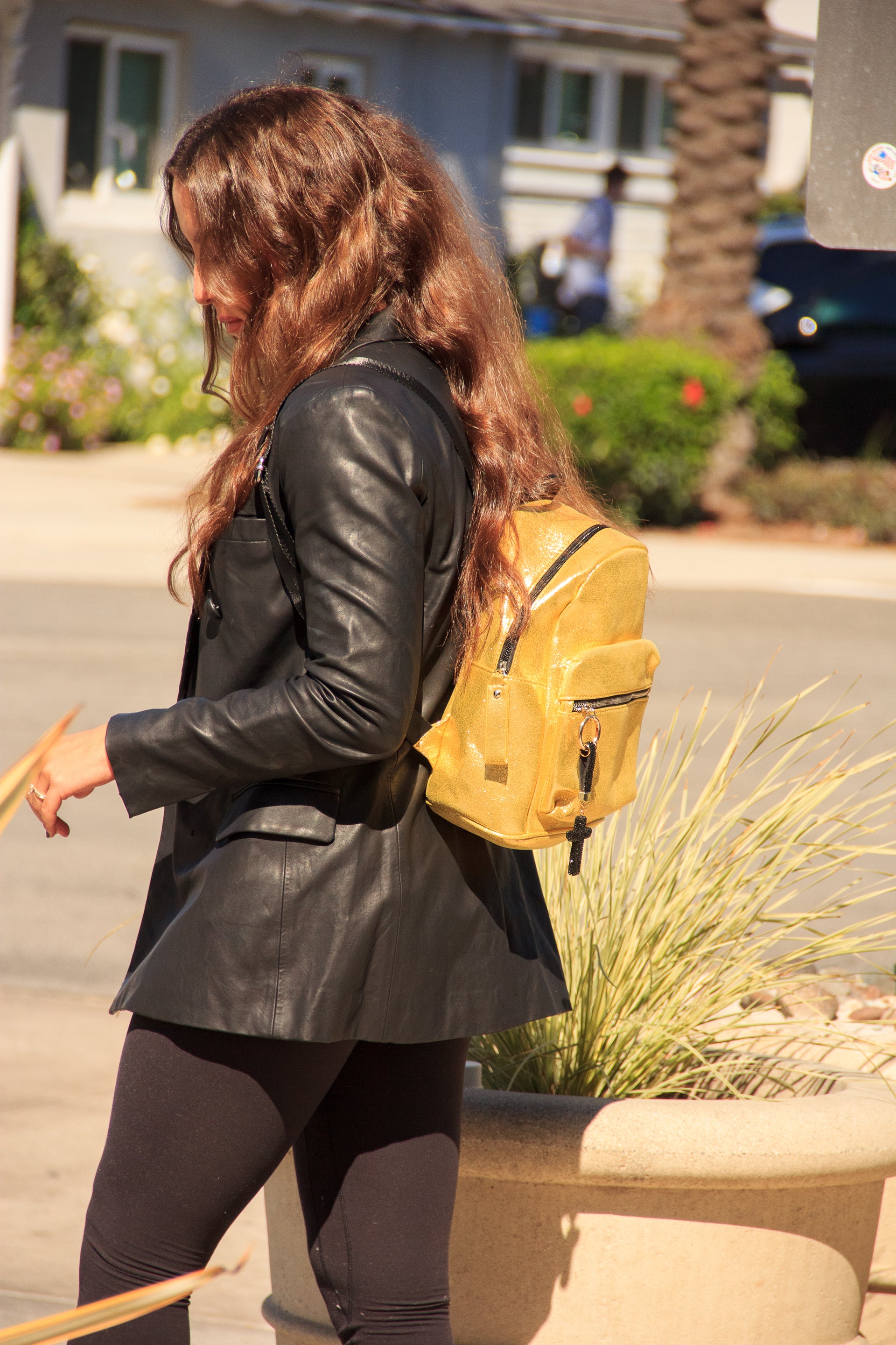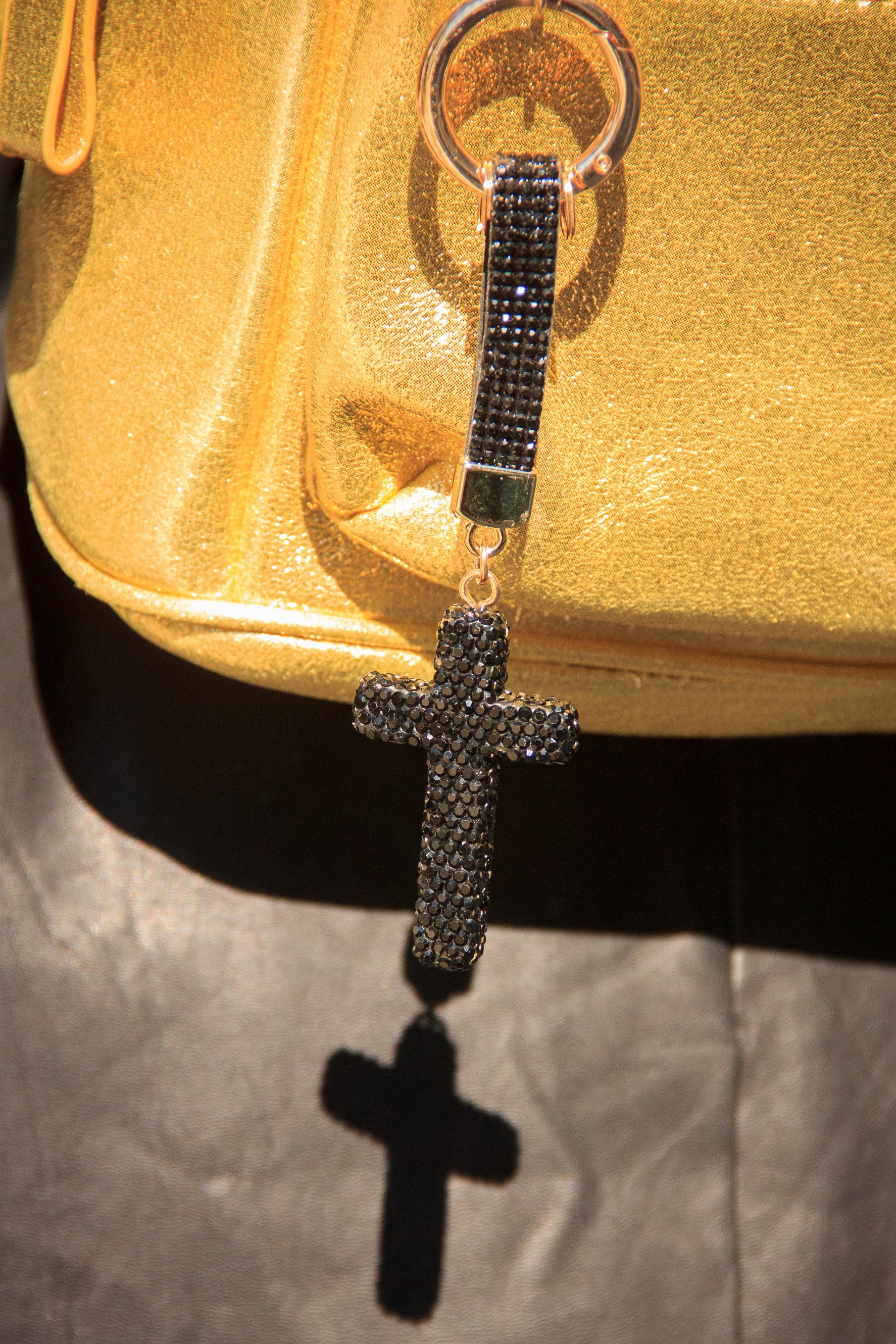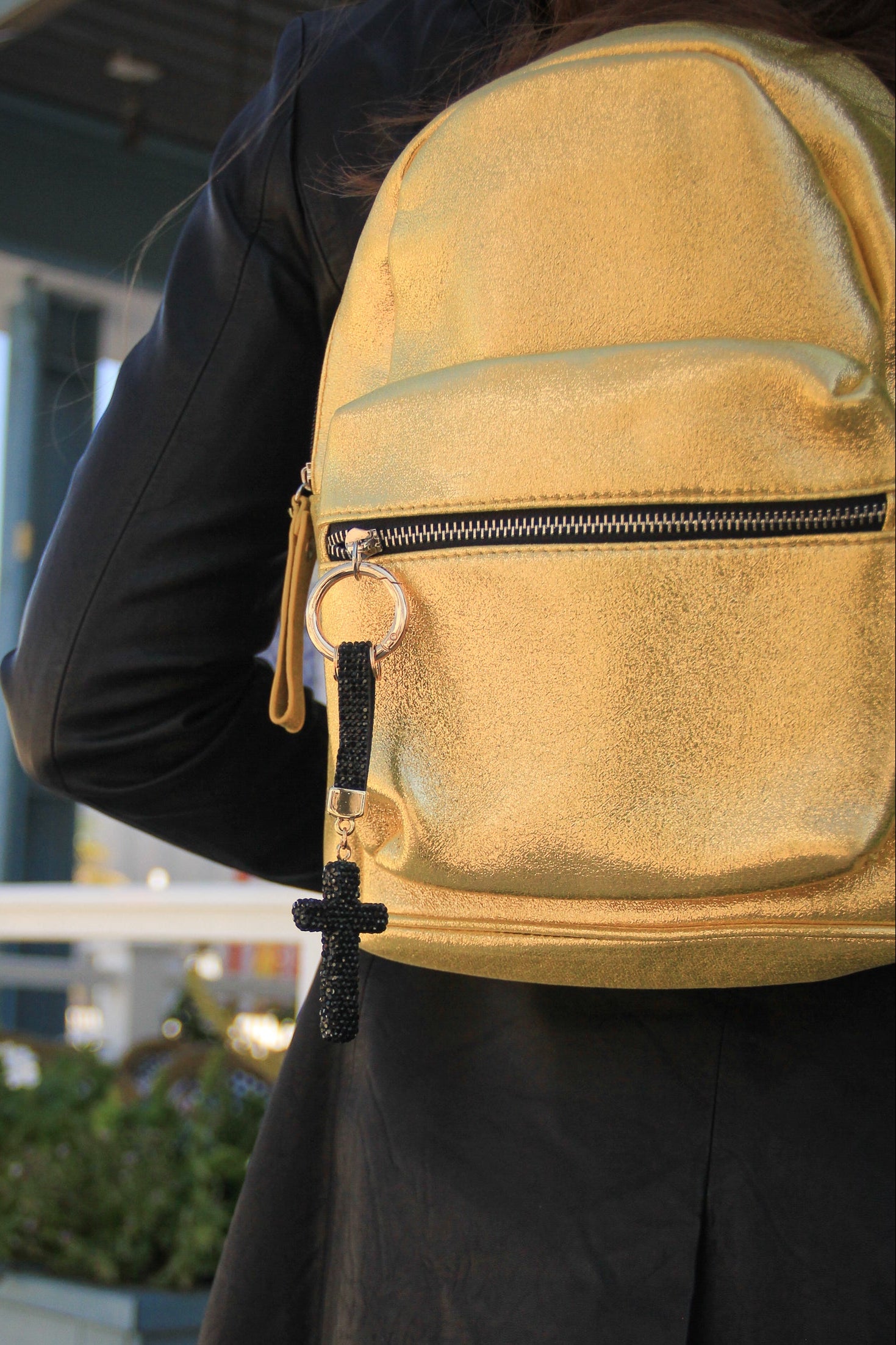Shine wherever you go with this stunning gold mini backpack. Compact yet spacious enough for your essentials, it features a radiant gold finish accented by a black rhinestone cross zipper pull. Designed for playful, on-the-go style, it adds a bold, glamorous touch to any casual look.