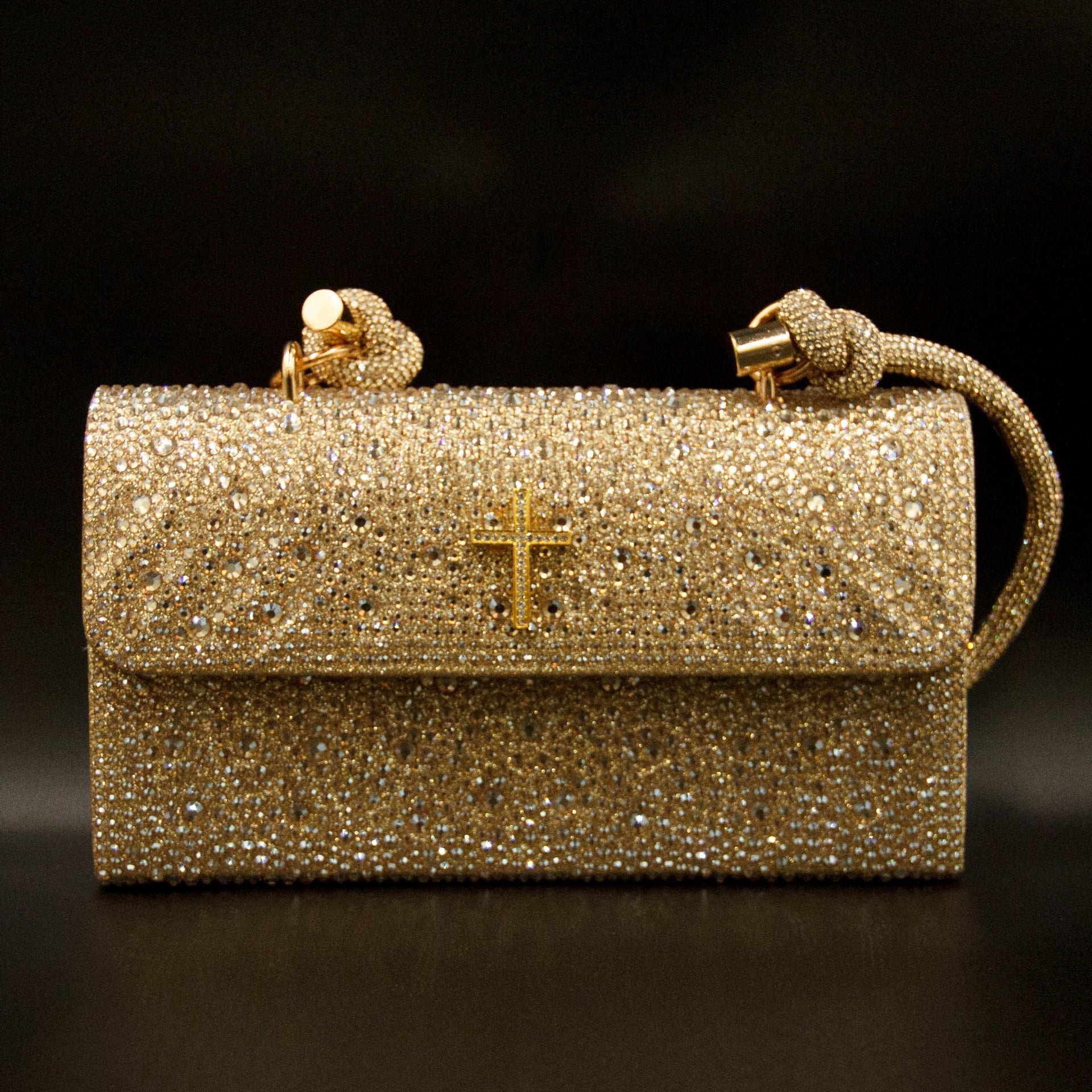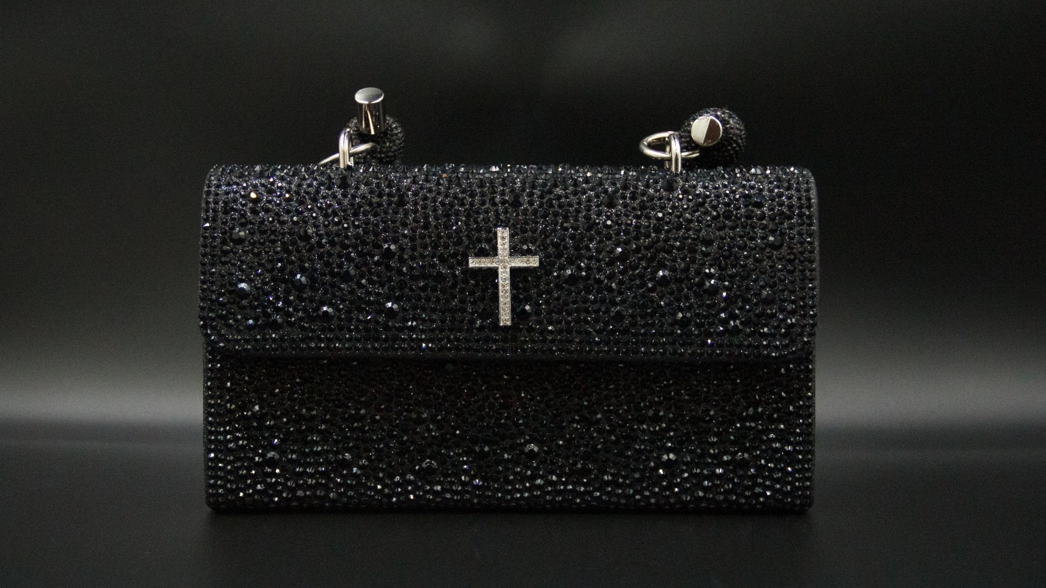 A striking statement piece designed to shine with purpose. Wrapped in shimmering black rhinestones and centered with a radiant silver cross, this elegant handbag blends timeless beauty with bold faith. Designed with a long shoulder strap and a perfectly sized silhouette, it holds all your essentials for any special event.