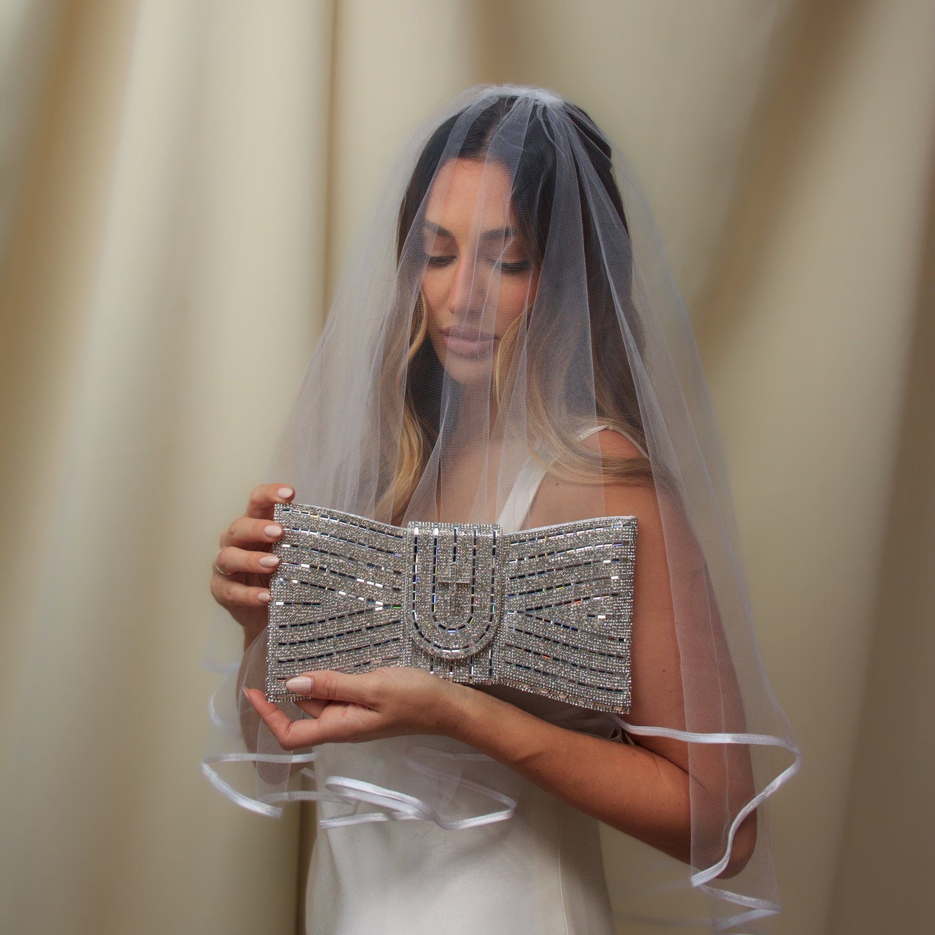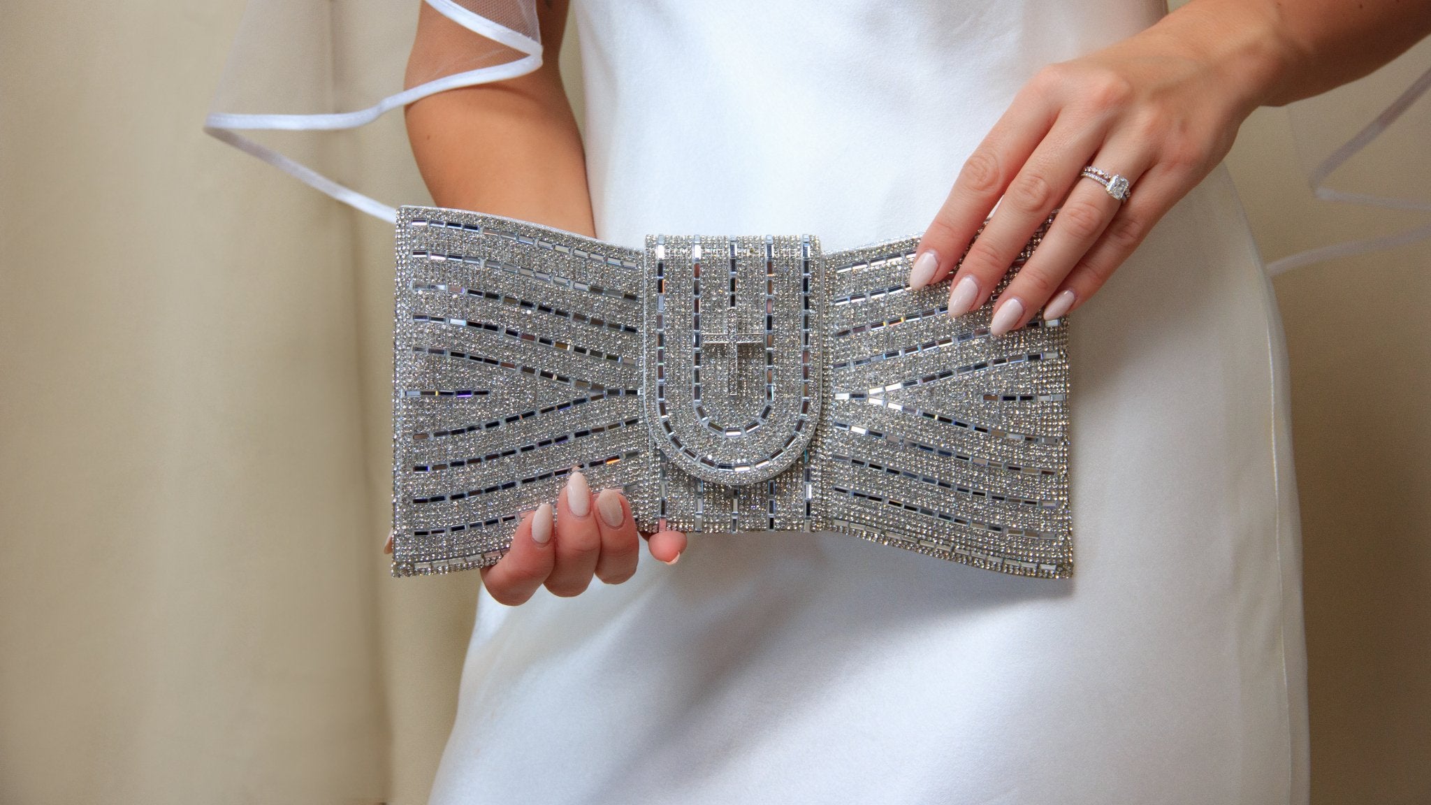 Adorned with radiant crystals, this statement piece captures the light from every angle. Its sleek silhouette, secure clasp, and elegant chain strap make it the perfect accessory for weddings, parties, or sophisticated evenings. A perfect finishing touch to your wedding ensemble.