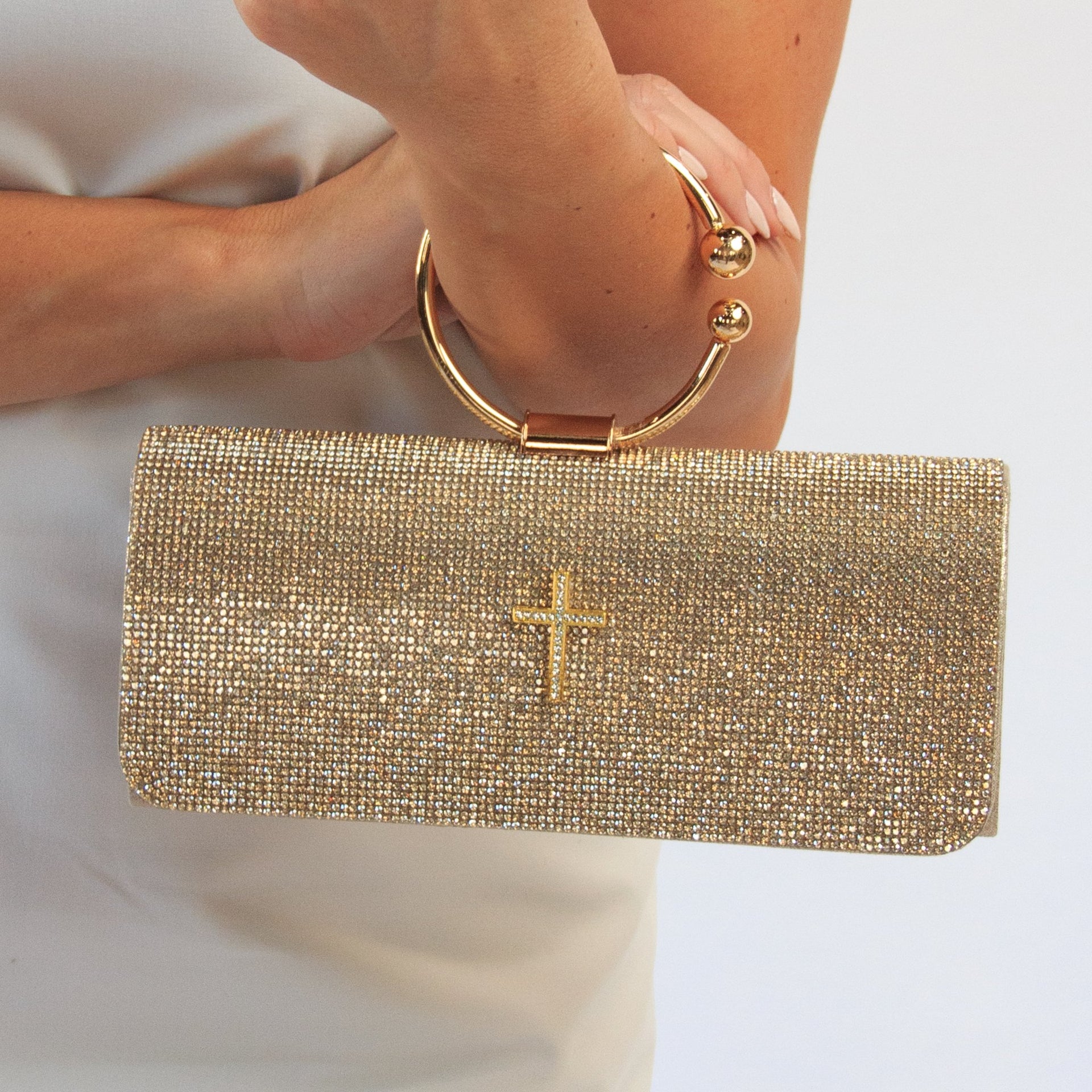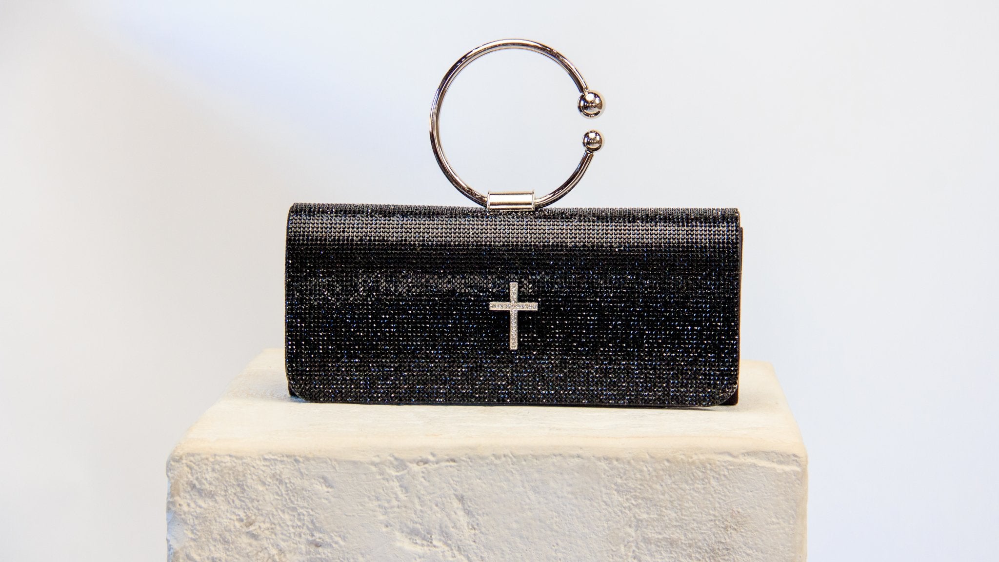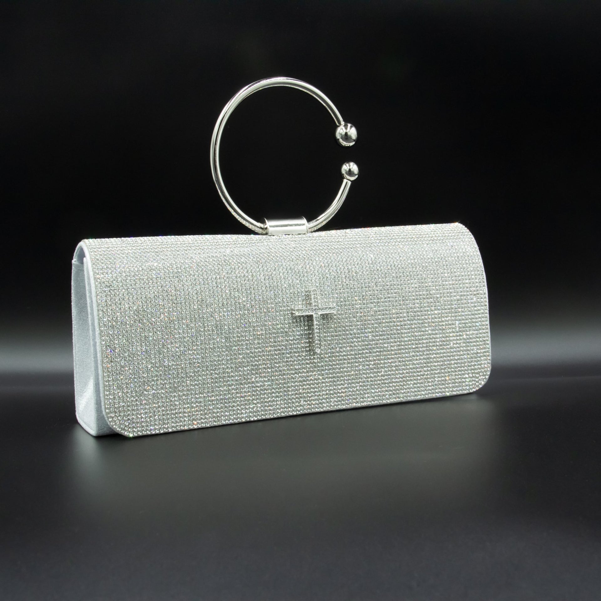 A striking statement piece that blends elegance, edgy flair, and meaningful symbolism. Its sleek circular handle adds both sophistication and practicality—designed to slip effortlessly around your wrist or be carried as a chic evening clutch. The shimmering rhinestone exterior catches every light, ensuring all eyes are on you wherever you go.